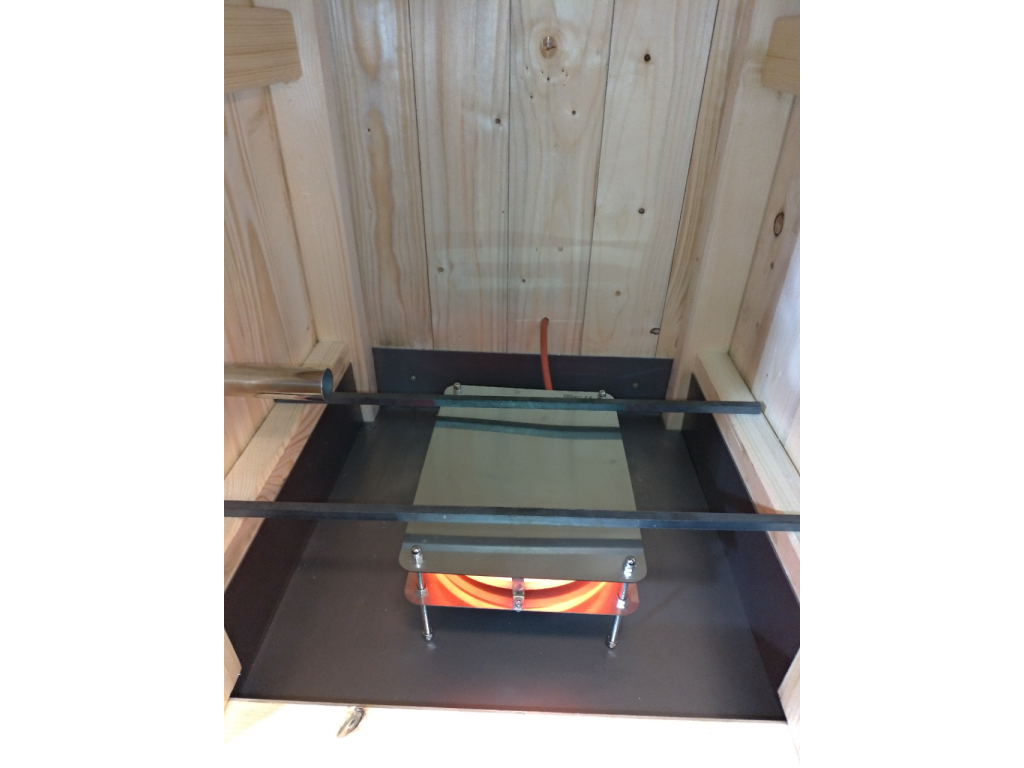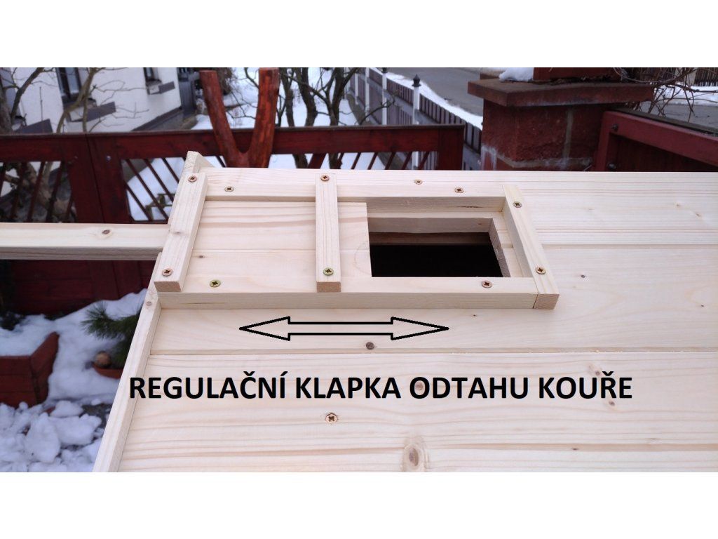 Konstrukce z hranolů 6x4 cm, opláštění z palubek 19mm. Udírna je bez povrchové úpravy. Případné kovové doplňky jsou lakované.